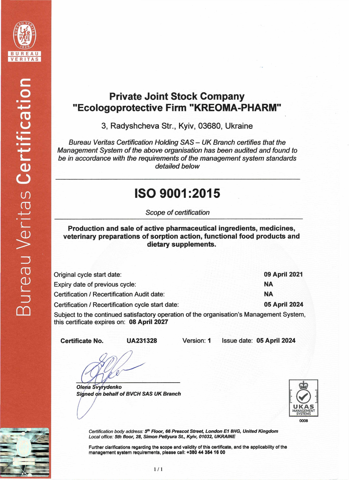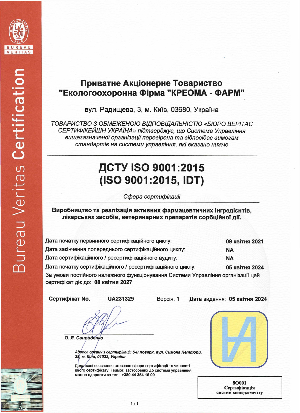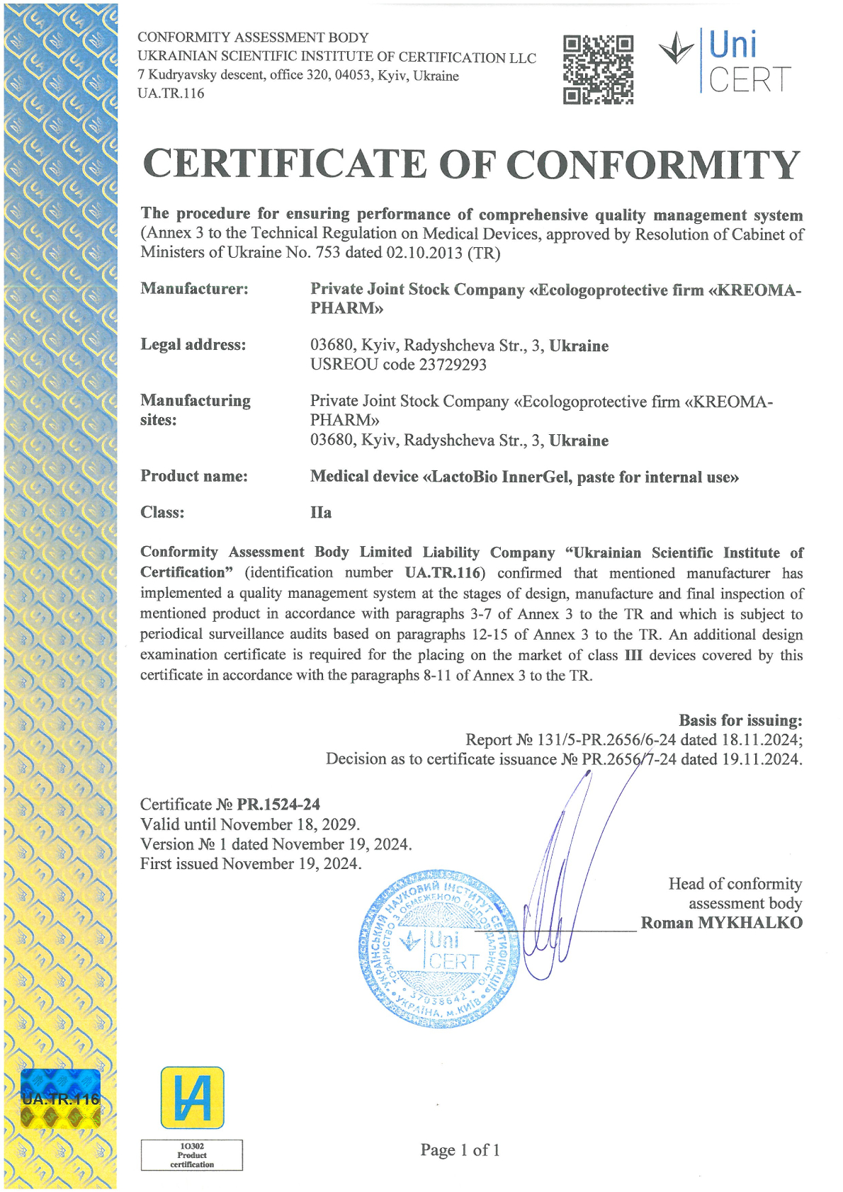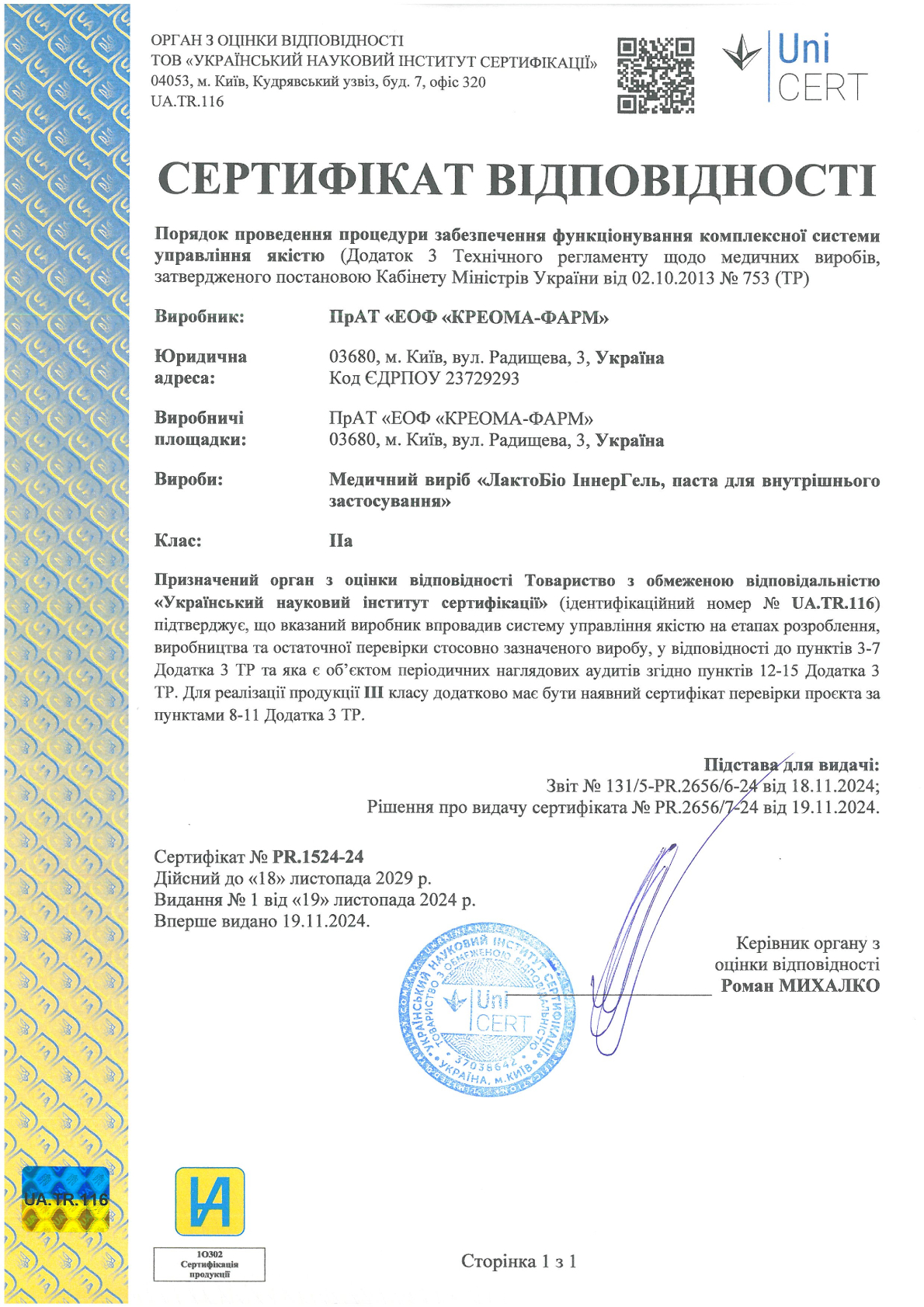 KREOMA-PHARM received a certificate of compliance with the requirements of